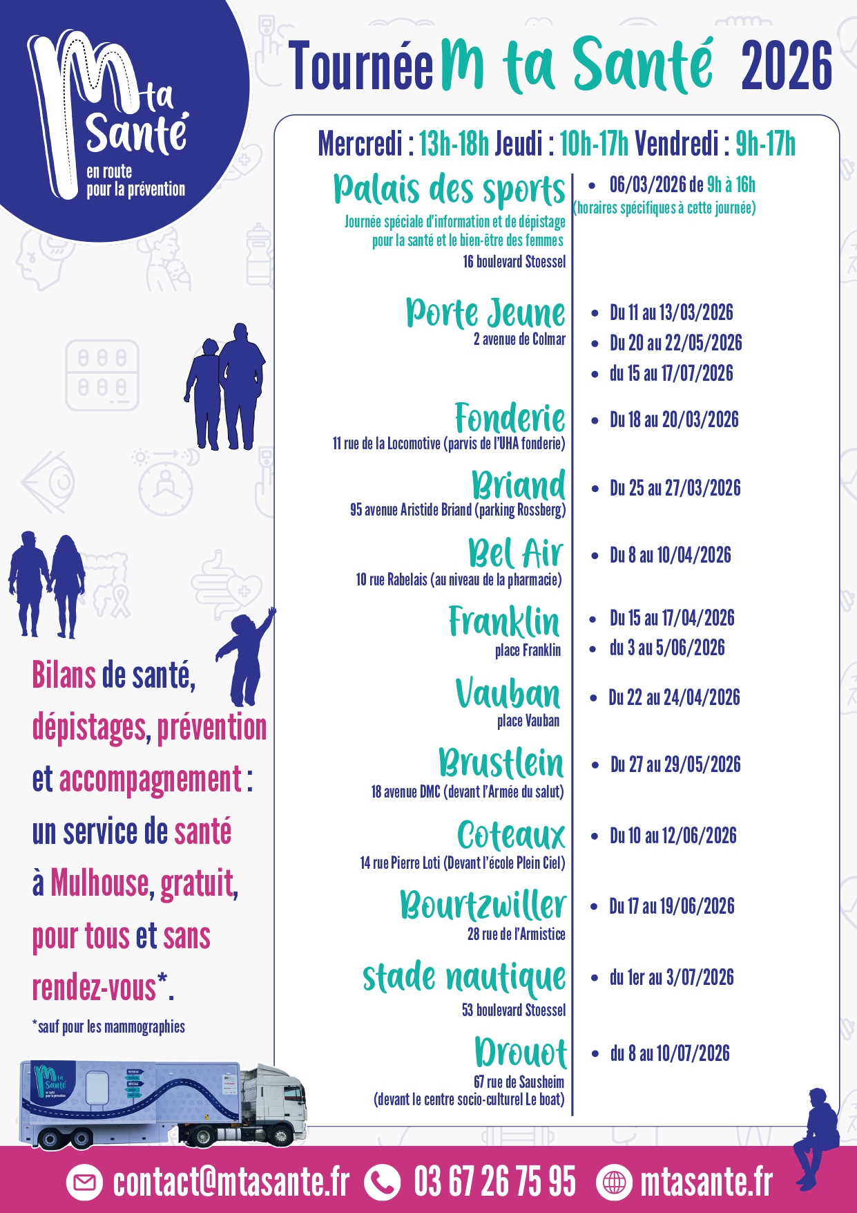 Tournée 2026 Kit de communication Dossiers de presse Flyers Tournée 2026 Par quartiers Bel Air Bourtzwiller Briand Brustlein Coteaux Drouot Fonderie Palais des Sports Place Franklin Porte Jeune Stade Nautique Vauban Tous les supports Support tournée 2026 Télécharger le support